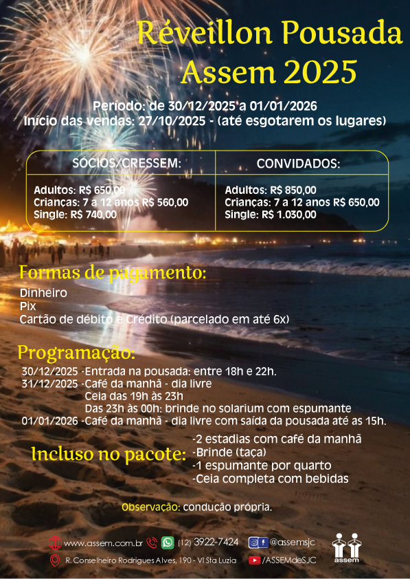 Que tal celebrar a chegada de 2026 em grande estilo, em um ambiente aconchegante e à beira-mar? A Pousada Assem Litoral preparou um Pacote Especial de Réveillon com Ceia para associados e seus convidados viverem momentos inesquecíveis!